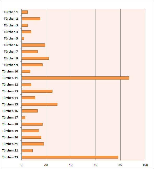 Offensichtlich war Puzzeln am beliebtesten (Türchen 11), dicht gefolgt vom Erraten weihnachtlicher Begriffe (Türchen 23). Alle anderen Türchen sind weit abgeschlagen.