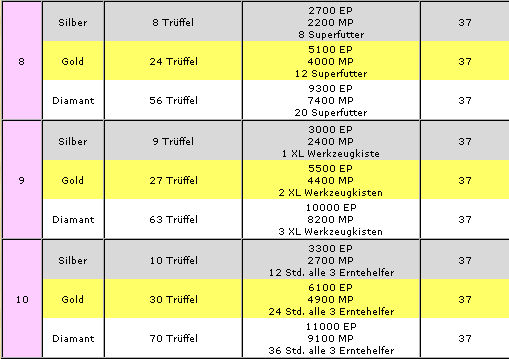 Mir ist aufgefallen, dass bei den Trüffeln die Belohnungen etwas runtergeschraubt wurden im Vergleich zu den anderen Erzeugnis-Quests. Gibt diesmal gar keine TGs und auch die Werkzeugkisten sind sehr mau. Aber egal. Vielen wird es sicherlich eh nur um die Sternchen gehen, wie mir auch. Aber bis ich da durch bin, werde ich noch etwas Zeit brauchen.