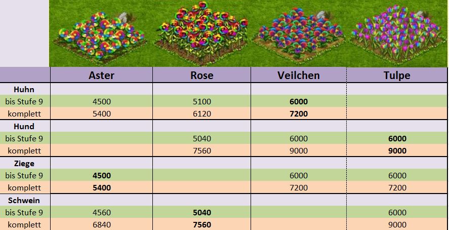 also du benötigst pro 3er-Schritt 315 Rosen – für jede Stufe brauchst du somit 1260 von den Rosen und bis Stufe 9 musst 4x Eventpflanzen abliefern.