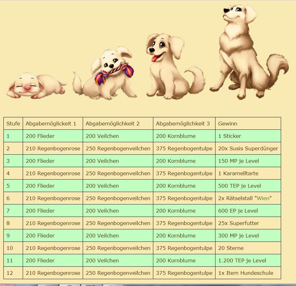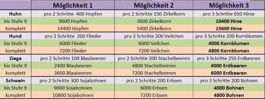 Wenn ihr immer mit vielen Schritten vorankommen wollt müsst ihr einfach die Spalte 3 machen, also Kornblumen, Hopfen und Erbsen dürften vorrätig sein … und dann würden nur die Eventpflanzen fehlen.