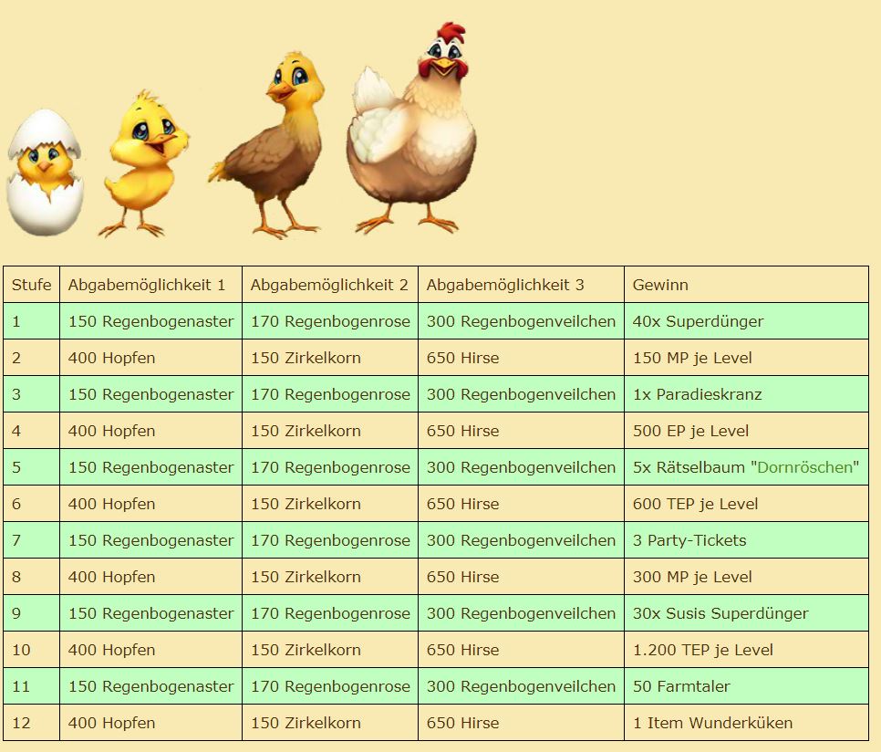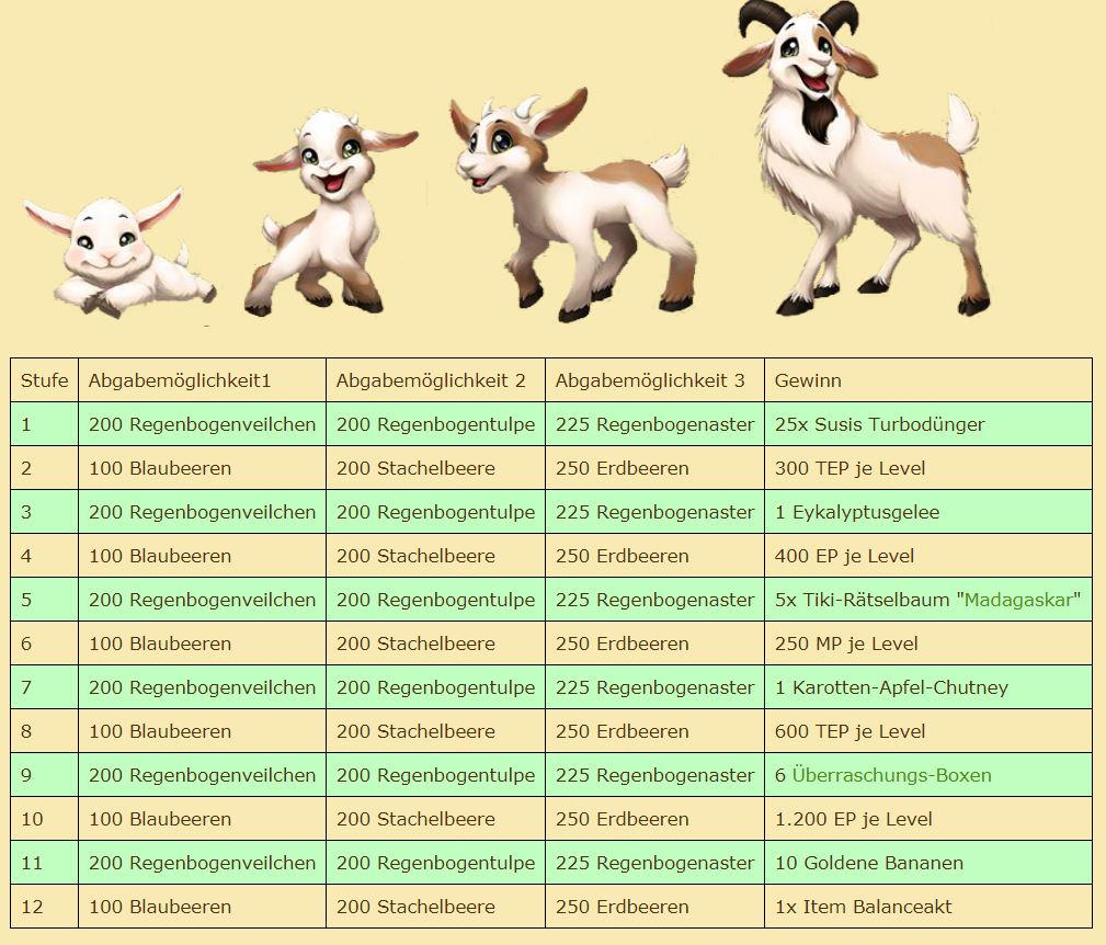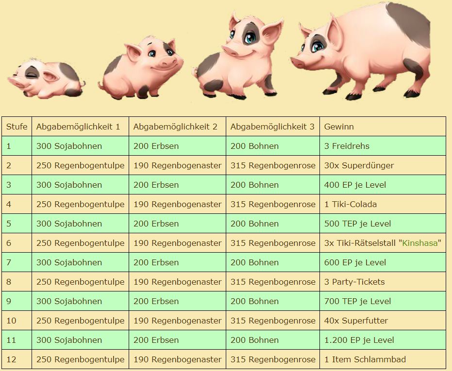 zuerst einmal vielen Dank für die Aufstellung der Abgabemengen an Pflanzen. Habe diesbezüglich eine kleine Anmerkung. Kann es sein, dass du bei dem Schwein Eventpflanze Rose dich vertan hast und die gesamte Abgabemenge für 12 Aufgaben geschrieben hast