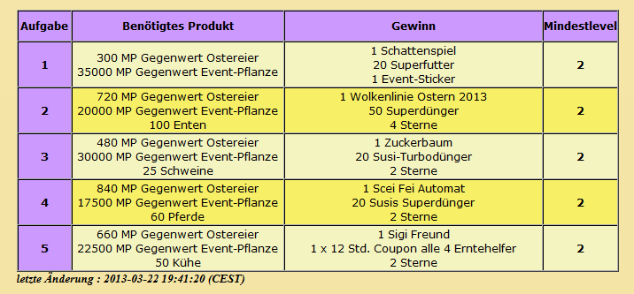 So habe auf seltsamerweise mit meiner Mainfarm das event gepackt und das ohne zukauf von Ostereiern mit oder irgend wie eg eingesetzt zu haben die eier waren gut und es sind noch welche über^^