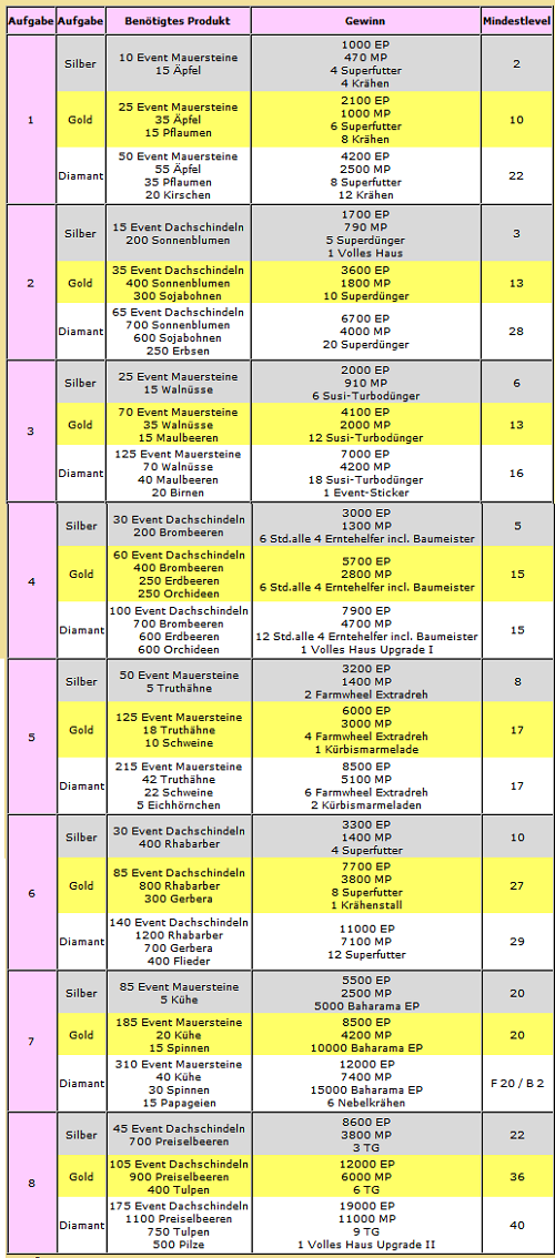 hallo ihr lieben farmerinnen und farmer, habe das event gestern ohne weiteren probleme geschafft. es war mal seit langen wieder ein arbeitnehmer freundliches event. wünsche mir mehr davon, dass berufstätige auch die chance haben etwas zu erreichen.