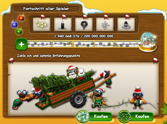 Im rechten Fenster sieht man den Fortschritt aller Spieler – die fünf Bilder oben sind weitere Verschönerungen der Stadt. Zu Ende erhalten wohl alle die Schneekugel.