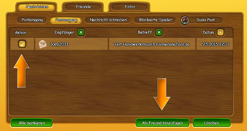 Ihr klickt das Häkchen vor dem Empfänger an (Aktion) und dann klickt Ihr auf als Freund hinzufügen.