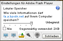 Bei mir läuft auch bei jedem Einloggen dieser lästige kleine Kasten auf. Das kann er machen so lange er will. Farmerama ist ein Browserspiel. Da will ich keinen Speicherplatz von meinem Rechner bereit stellen. Da muss schon der Spielanbieter (BP) dafür sorgen, dass bei immer mehr Spielern und immer mehr Animation und damit auch Grafikleistung die Balance stimmt und das Spiel gut und flüssig läuft. Das kann und sollte nicht auf die Spieler abgeladen werden.