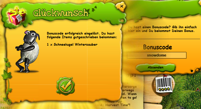 Um die Schneekugel zu erhalten gebt den Bonuscode: snowdome ein. Die Schneekugel gibt alle 16 Stunden 4,5 EP x Level.