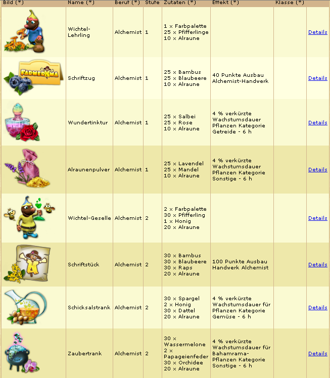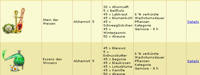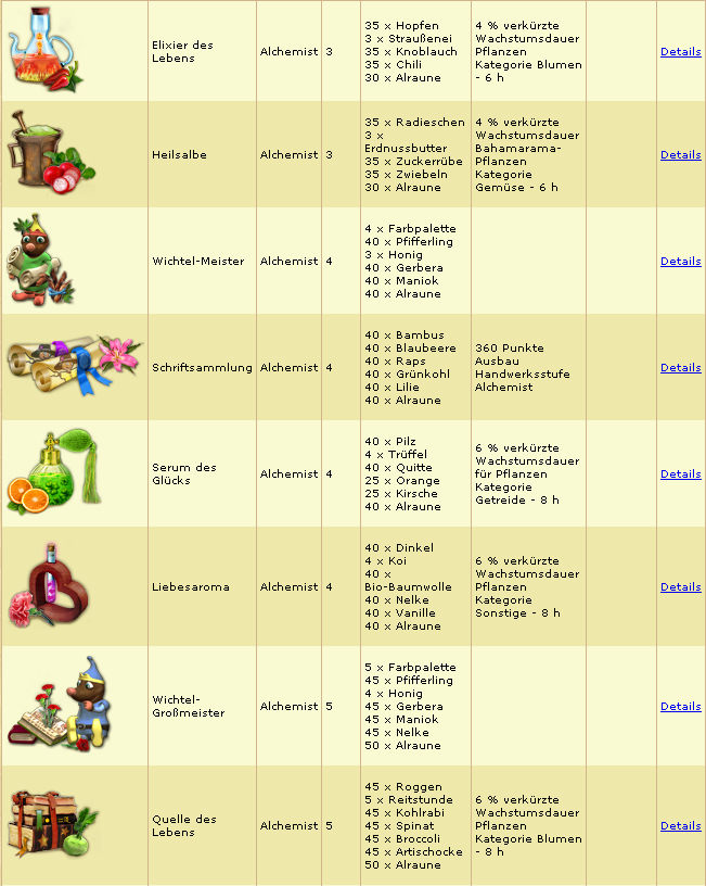 hmm ich dachte das zählt zu sonstige pflanzen… und durch die 4er felder macht das schon gar keinen sinn mehr. selbst wenn ich dadurch 30% „zeitbonus“ komme – die werden ja leider nicht erst addiert sondern von jeweiligen „Stand“ abgezogen. also bringen dünger, wasser, sd etc. entsprechend weniger. dafür dann aber 20 pflanzfelder zu opfern – die rechnung geht nicht auf! und selbst wenn es „nur“ 5 felder wären – das Handwerk ist nett, aber nicht durchdacht. fazit: handwerk freischalten und erst mal wie beim florist und spa die drops sammeln und abwarten. der marmeladenkoch hatte am anfang auch nicht gerade die „megarezepte“. die haben jetzt 4 berufe und man wird sicherlich noch das eine oder andere nette Rezept bekommen. gerade im bereich SD könnte ich mir vorstellen das der alchi da tätig sein könne.