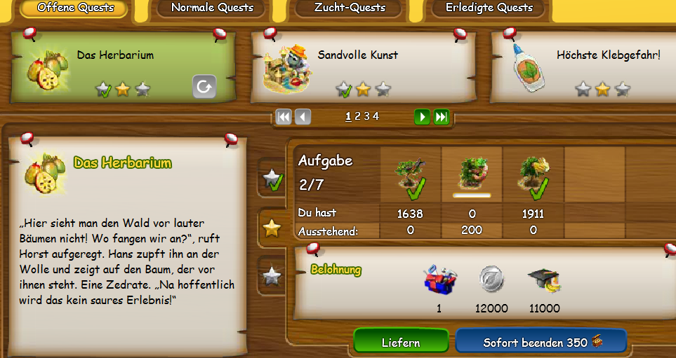 Jetzt gibts bei den Dauerquests auch keine Sternchen mehr? Ich dachte, das würde für die Events gelten. Und überhaupt, ich muss dir einfach recht geben, Kubi, diese neuen Quests sind einfach blöd. Ich hab bisher ja immer mal ein paar Baumsetzlinge und Rätselställe gekauft, aber bei meinem Glück müsste ich Hunderte davon kaufen, um das Zeug alles – vielleicht – mal zu bekommen, oder auch nicht.