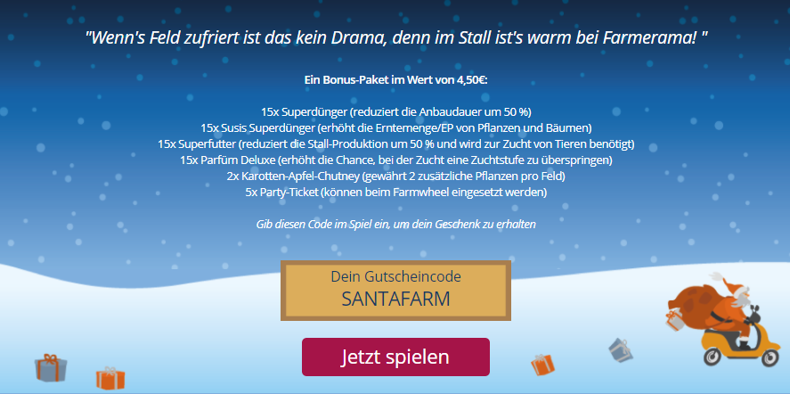 Hallo, Danke für die Bekanntgabe des Codes. Bei der Eingabe von SANTASFARM erfolgt keine Buchung.